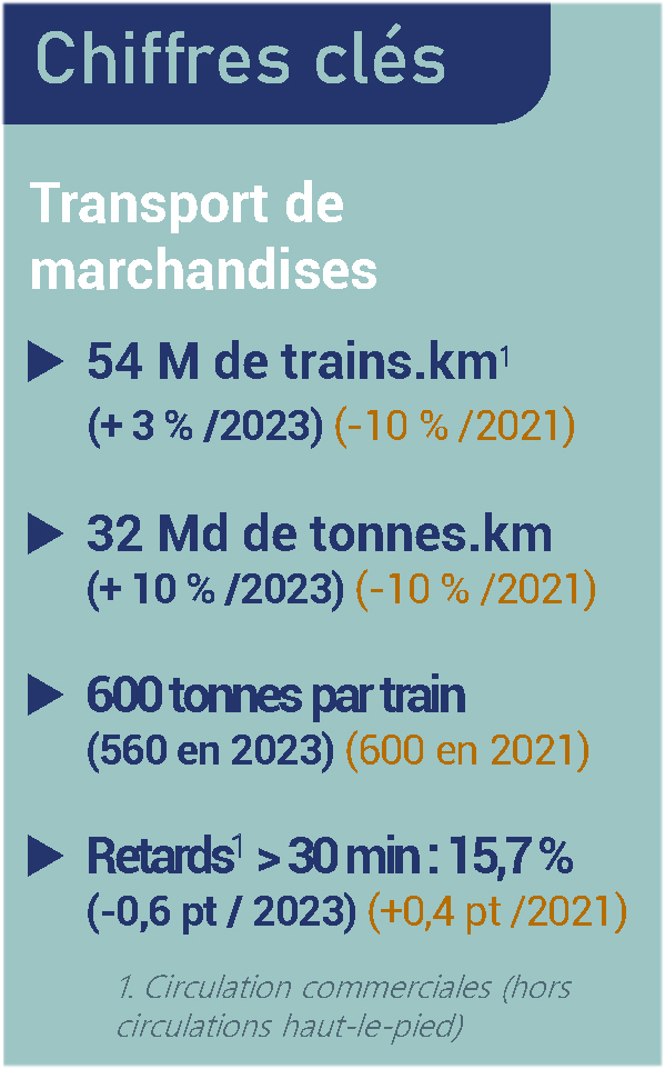 Selon les chiffres publiés par l’autorité de régulation des transports (ART), après une forte baisse en 2023, le marché du transport de marchandises est reparti à la hausse en 2024, du fait essentiellement d’une croissance de 20 % du segment du transport combiné. Le volume global de trafic, qui atteint 32 Milliards de tonnes/km, reste cependant inférieur de 10% à ses niveaux de 2021 et 2022. Cette progression a été possible grâce à une hausse de 3 % du nombre de trains/km, mais aussi grâce à l’augmentation de 7 % de l’emport moyen des trains, qui a retrouvé le niveau de 600 tonnes par train observé en 2021 et 2022.