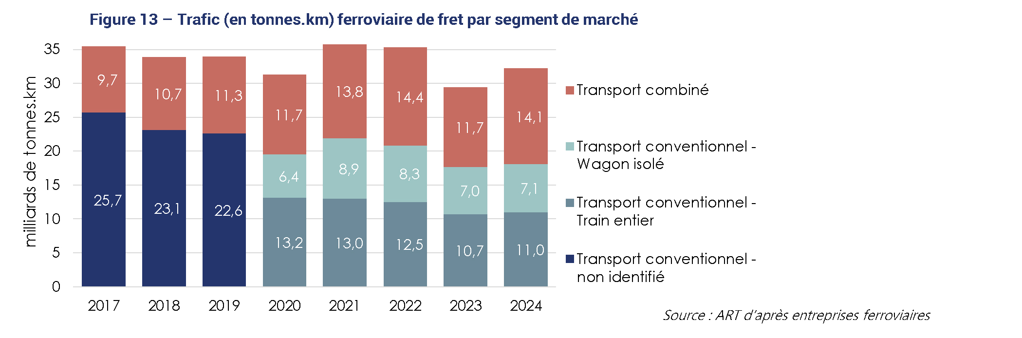 Selon l’ART, le rebond de l’activité est porté en premier lieu par le transport combiné, qui atteint 14,1 Mds de tonnes.km et progresse ainsi de 20 %, mais demeure toutefois inférieur de près de 2 % à l’année 2022, où les entreprises ferroviaires avaient réalisé 14,4 Mds de tonnes.km. Le transport conventionnel a connu une croissance très faible en revanche entre 2023 et 2024, et demeure très en deçà des niveaux observés en 2021 et 2022.