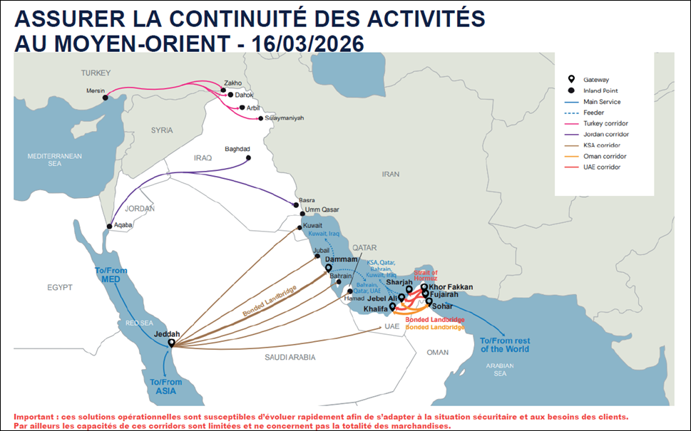 Face à la situation au Moyen-Orient et aux restrictions affectant le trafic maritime dans le détroit d’Ormuz, CMA CGM met en place des mesures d’urgence afin d’assurer la continuité des transports dans la zone. Le groupe annonce le déploiement de solutions multimodales alternatives combinant transport maritime, ferroviaire et routier afin de garantir la fluidité des flux logistiques et « permettant de relier les Émirats arabes unis, l’Arabie Saoudite, le Sultanat d’Oman, l’Irak, le Qatar, Bahreïn, le Koweït et la Jordanie depuis les ports de Khor Fakkan, Fujaïrah, Sohar et Jeddah situés hors du détroit d’Ormuz », mentionne-t-il dans un communiqué.