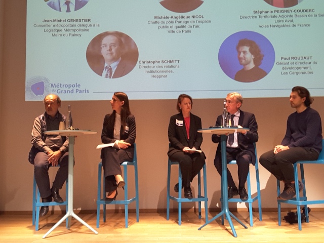 - De g. à dr. : Christophe Schmitt (Heppner), Stéphanie Peigney-Couderc (VNF), Michèle-Angélique Nicol (Ville de Paris), Jean-Michel Genestier (MGP), Paul Roudaut (Les Cargonautes)