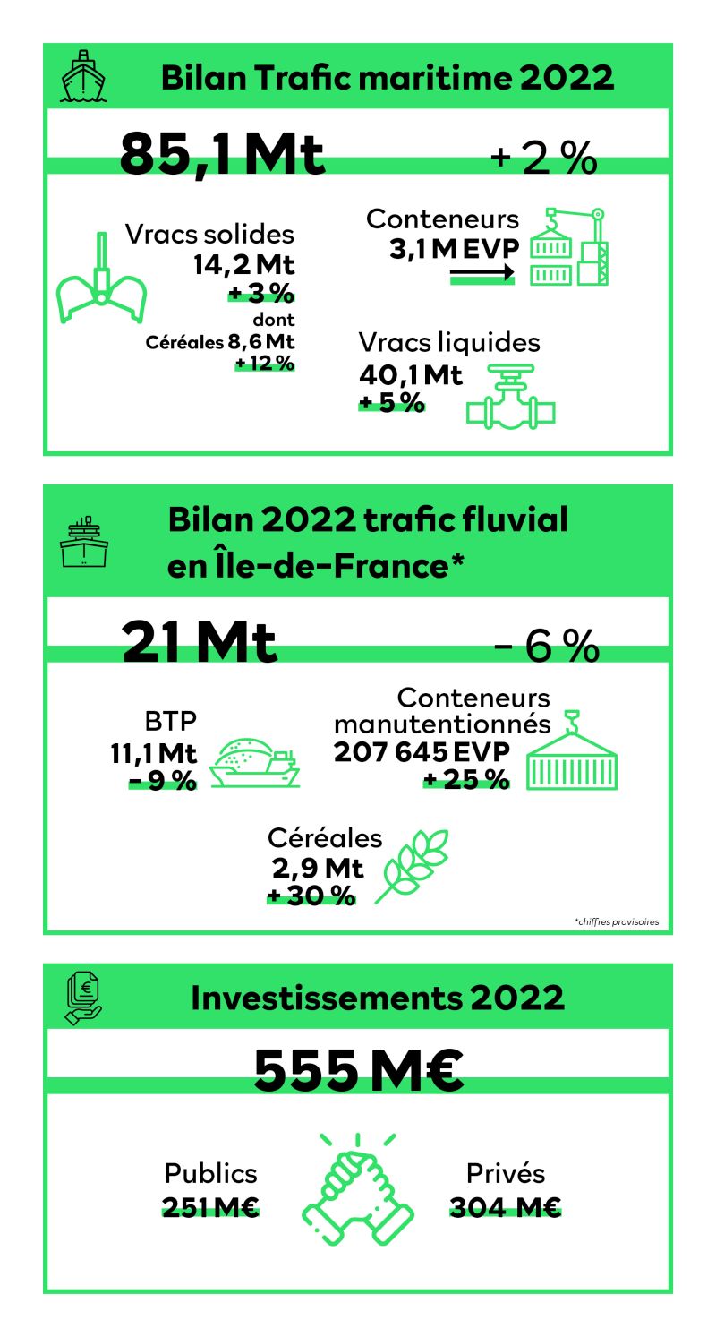 En matière de trafics, Stéphane Raison souligne que Haropa « a fait mieux que résister » en 2022 dans un contexte marqué par de multiples crises. Le trafic maritime total progresse ainsi de 2%, à 85,1 Mt. Les vracs liquides et solides ont contribué à cette progression, respectivement + 5 % (40,1Mt) grâce à l’envolée du trafic de pétrole brut et +3% (14,2 Mt) portés notamment par les céréales. Le trafic conteneur, marqué par de forts volumes début 2022 puis un net tassement, ressort stable par rapport au point haut de 2021, à 3,1 MEVP. Dans un contexte de baisse de trafic conteneur dans le range nord, Haropa a ainsi gagné des parts de marché sur ses concurrents du nord de l’Europe. Néanmoins, le tonnage a baissé de 5 % (28,4 Mt) en raison d’une importante proportion de conteneurs vides fin 2022. Le roulier recule aussi de 11 % avec 265 000 véhicules. La croisière devrait retrouver son niveau de 2019 en 2023.